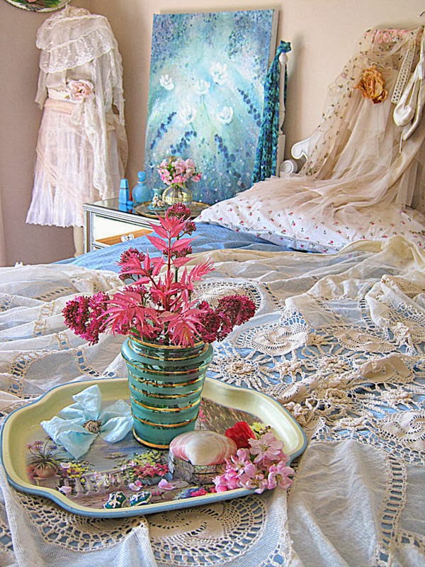 My garden is still scant of flowers however the next door neighbors' lovely blossom tree was hanging oh so temptingly over the fence....l'm sure they won't mind:-)